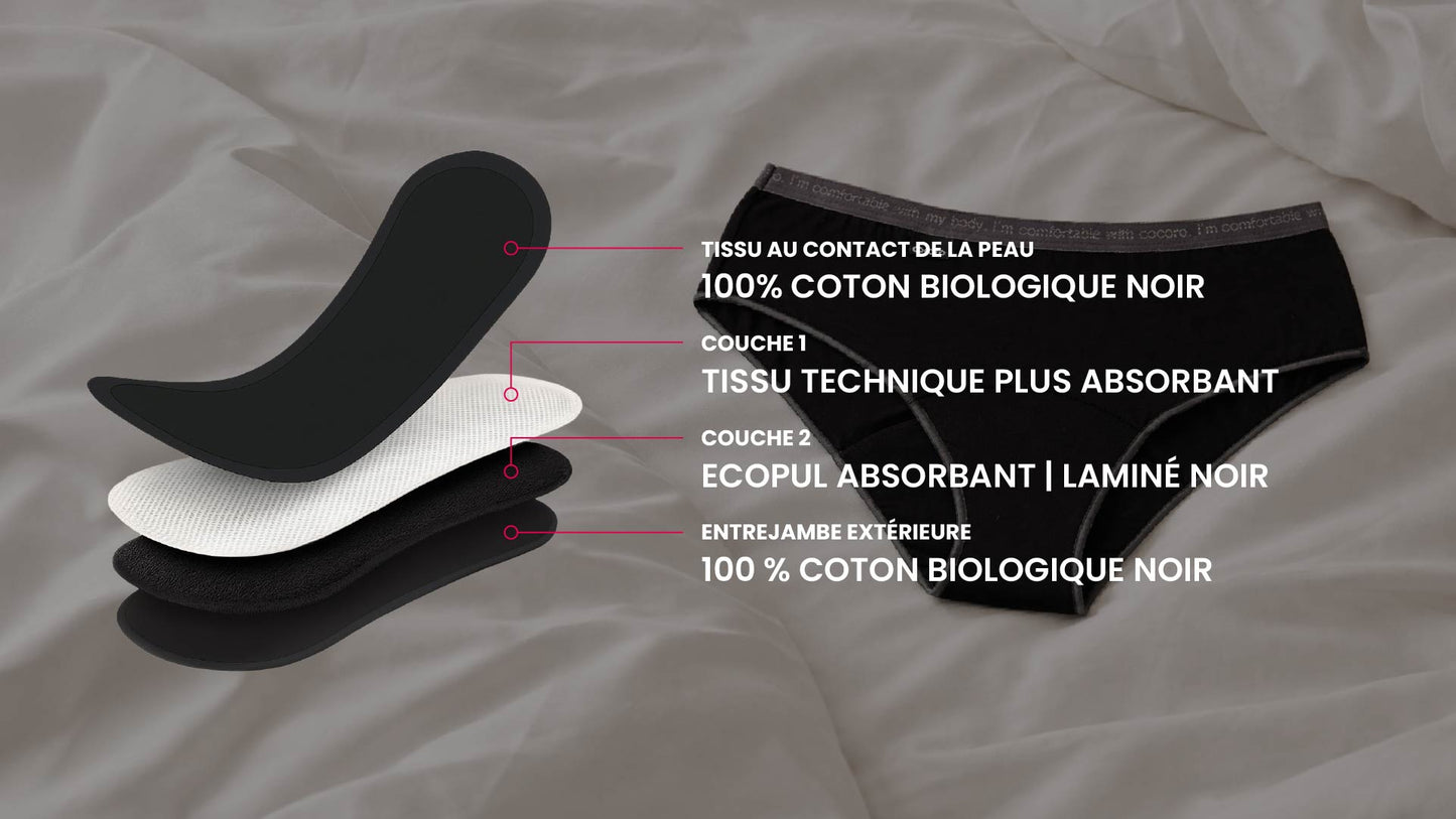 Culotte menstruelle aux lignes épurées et à la coupe classique. Un indispensable de votre garde-robe, confectionné en coton biologique et orné d'un message inspirant à la taille : « Je suis bien dans mon corps. Je suis bien avec Cocoro. »