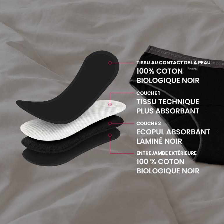 Elle possède un système de couches absorbantes et une couche hydrofuge pour que votre flux ne fuie pas, vous vous sentez beaucoup plus en sécurité et votre corps continue de transpirer librement.