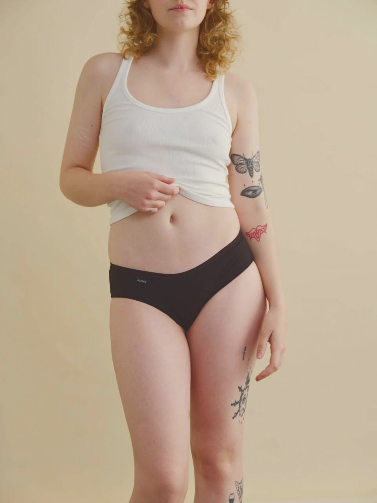 Braguita menstrual de líneas sencillas y corte clásico. Una pieza esencial en tu armario, hecha de algodón orgánico y con un mensaje empoderador en la cintura que dice: I'm comfortable with my body. I’m confortable with Cocoro.